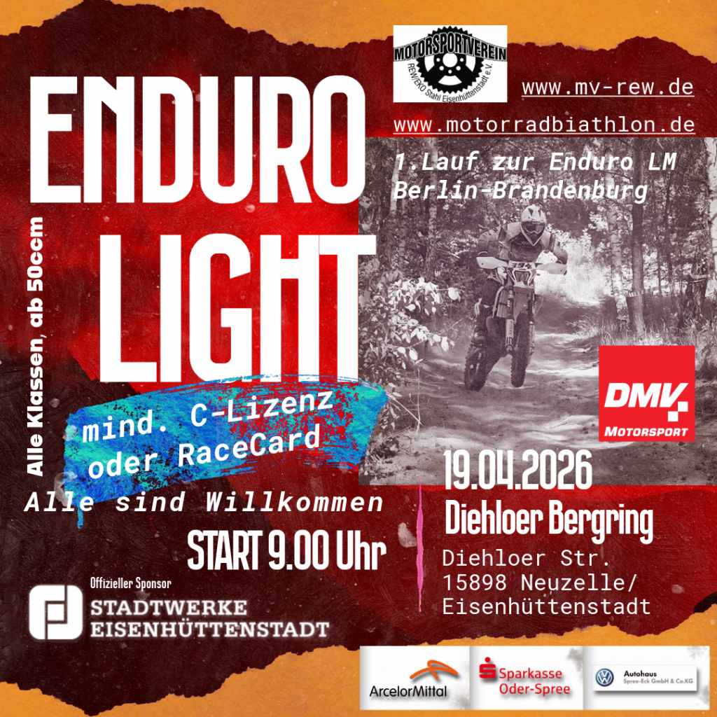 Am 19.04.2026 wird es eine Enduro Light-Veranstaltung auf dem Diehloer Bergring Eisenhüttenstadt geben. Bei der Veranstaltung gehen alle Klassen an den Start ab 50ccm bis zu den Super Senioren. Das Enduro ist gleichzeitig der erste Lauf zur Landesmeisterschaft Berlin-Brandenburg. Veranstalter ist der REW/EKO Stahl Eisenhüttenstadt e.V. . Für viele ist Enduro Light noch kein Begriff, deshalb findet Ihr hier eine kurze Erklärung wie dieses abläuft. Bei dieser Veranstalltung können alle interessierten Motorsportler mit geeignetem Motorrad teilnehmen. Für die Nennung ist eine C-Lizenz oder eine Racecard erforderlich. Beides ist beim DMSB zu bekommen. Das Fahrerlager ist ab Samstag den 18.04.26 ab 18.00 Uhr für die Endurofahrer geöffnet. Die Nennung findet ab Ende Februar/Anfang März über Triga Zeitnahme statt, der Link zur Nennung wird hier und auf der Seite von Triga sowie REW/Eko Stahl bereitgestellt, wenn Ihr dierekt informiert werden wollt könnt Ihr euch in meinem Newsletter anmelden dann bekommt Ihr die Info sofort per e-Mail. Die Teilnehmerzahl für die Klassen E1 bis Super Senioren ist vorerst auf 120 begrenzt. Die Klassen 50-65ccm haben keine Begrenzung.